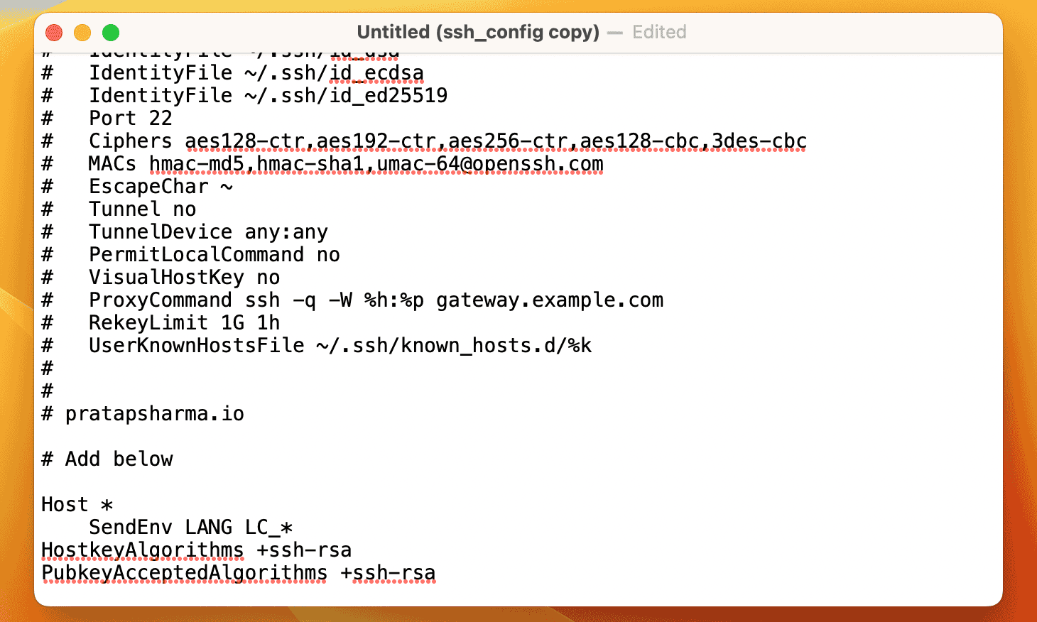 PubkeyAcceptedAlgorithms +ssh-rsa- After making the changes, press the Command+S keys to save the modifications.